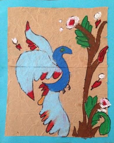 Here is Avery's latest Art Smarts project. Today she created a colorful bird on a lunch sack that was crinkled to give the appearance of Amate paper. This is my favorite one of her art pieces!