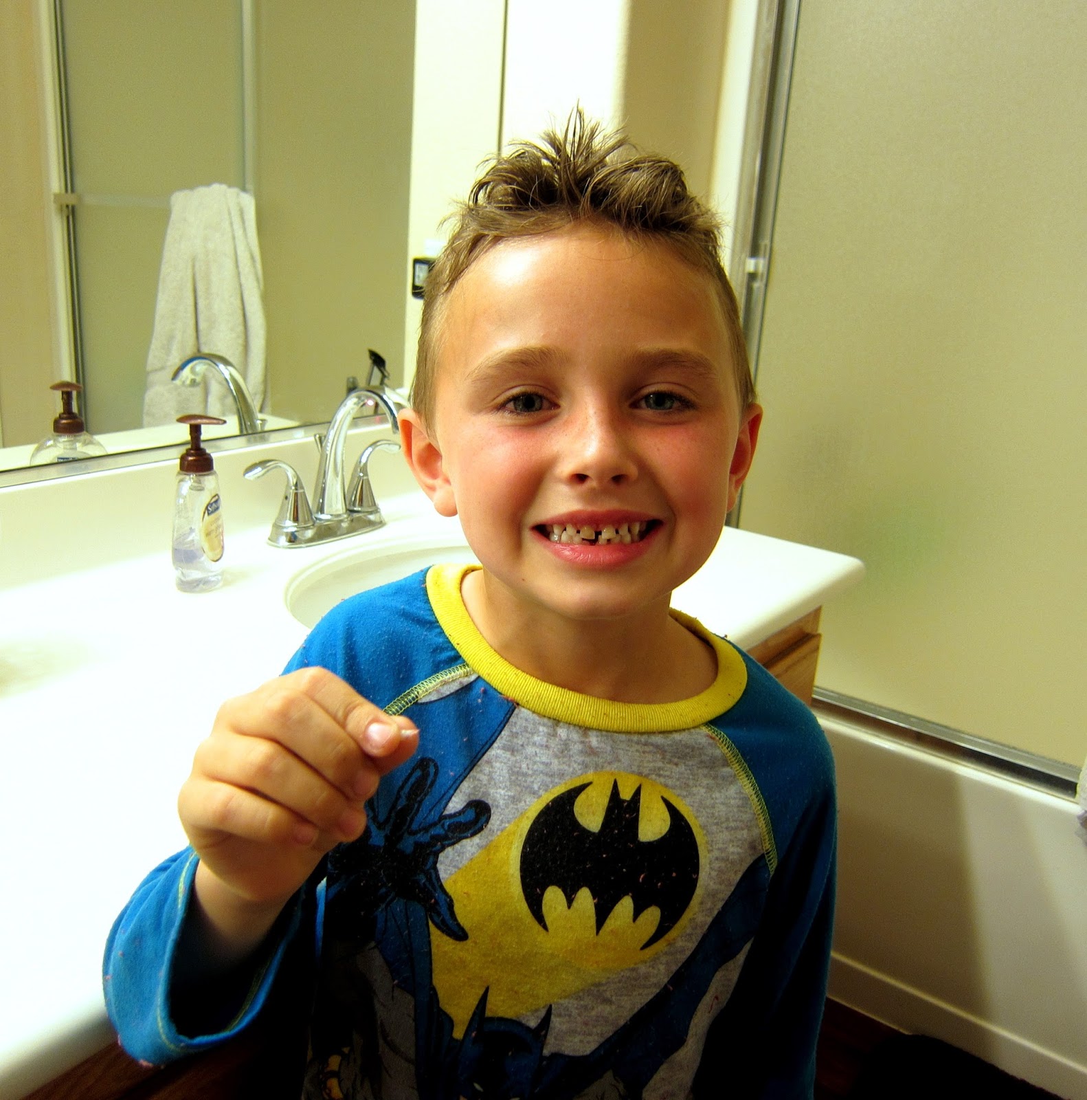 Callum lost his first tooth last night! So.... I wish I could say it just fell out on its own, but that's not really the case. After he had finished brushing his teeth I went over to take a look at it. Well, it was already loose and the second tooth was already making its way out. So I was going to wiggle the tooth a little in hopes to get it to come out quicker. As I went to go push it back, almost the entire tooth popped out. It was hanging by a string, not to mention there was quite a bit of blood which I think really freaked him out. So after a few minutes of rinsing his mouth, his dad lightly pulled the the rest of the tiny tooth out and there it was! It all happened so fast he didn't know what to think at first. After his gums settled down he was very happy and put his tooth in an envelope for the tooth fairy. He was so excited to tell his friends at school this morning.