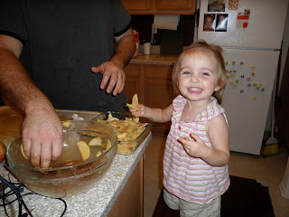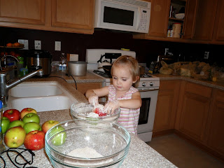 Avery had fun today helping daddy make a very yummy apple crisp. It was her first time baking and she had a good time tasting all the ingredients before they went into the oven. She was quite an excellent little helper and didn't mind getting in there and getting her hands dirty. I am hoping she will inherit her daddy's cooking skills. I think her favorite part of all was eating it for dessert...mmmmmm.