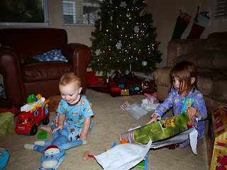 I must say, it was definately the year for dress up clothes for Avery. All said and done, she ended up with 7 new princess dresses, with accessories of course, which she has literally been parading in all day. Callum did pretty well also. One of his favorite gifts was a lionel train set. He loves holding the remote himself and watching the train go around the track, as he yells "Choo Choo", everytime it goes around.