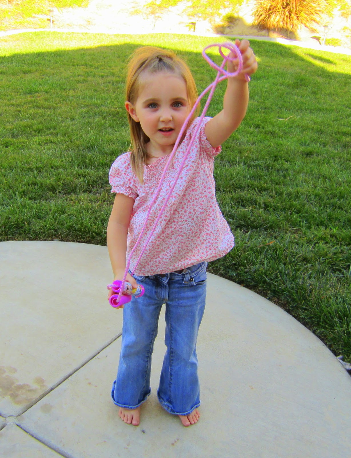 Avery picked a new jump rope out of the treasure box at school today...a princess one mind you. Her class has a reward system in which the kids get to pick a reward out of the box for being such a good listener for the day, but today they all got to choose something out of the box. The jump rope is now her new favorite toy and she's been practicing around the house all afternoon. She will soon be little jump rope champ of the house!