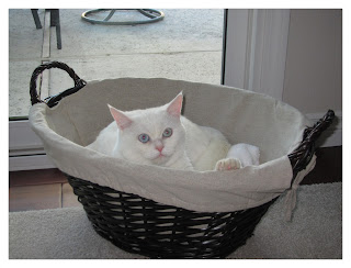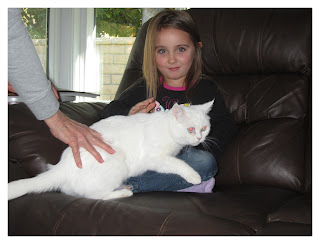 So my parents adopted a new cat last week and the kids and I have been waiting all week to go see her. We finally got a chance to meet her and I must say, she is the most friggin adorable cat EVER. She's such a loving little, white bundle of fur and her name is Pearl. She is part persian and has somewhat of a flat little face and big blue eyes. She is such a sweetheart and we love her (yes, I know she's not ours, but we still love her). The best part is, she doesn't scratch or bite and she's a total lap cat (the best kind). I told my mom if it didn't work out for whatever reason, we'd be more than happy to take her in...lol! Pretty sure that's not gonna happen, but thought I'd try anyway. Here are some photos of sweet Pearl.