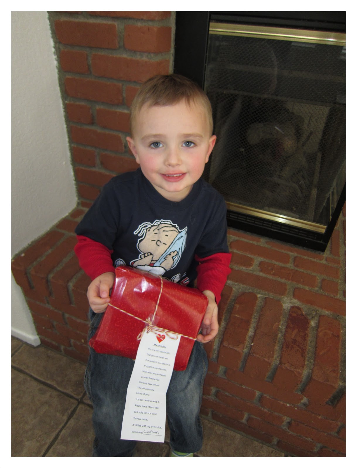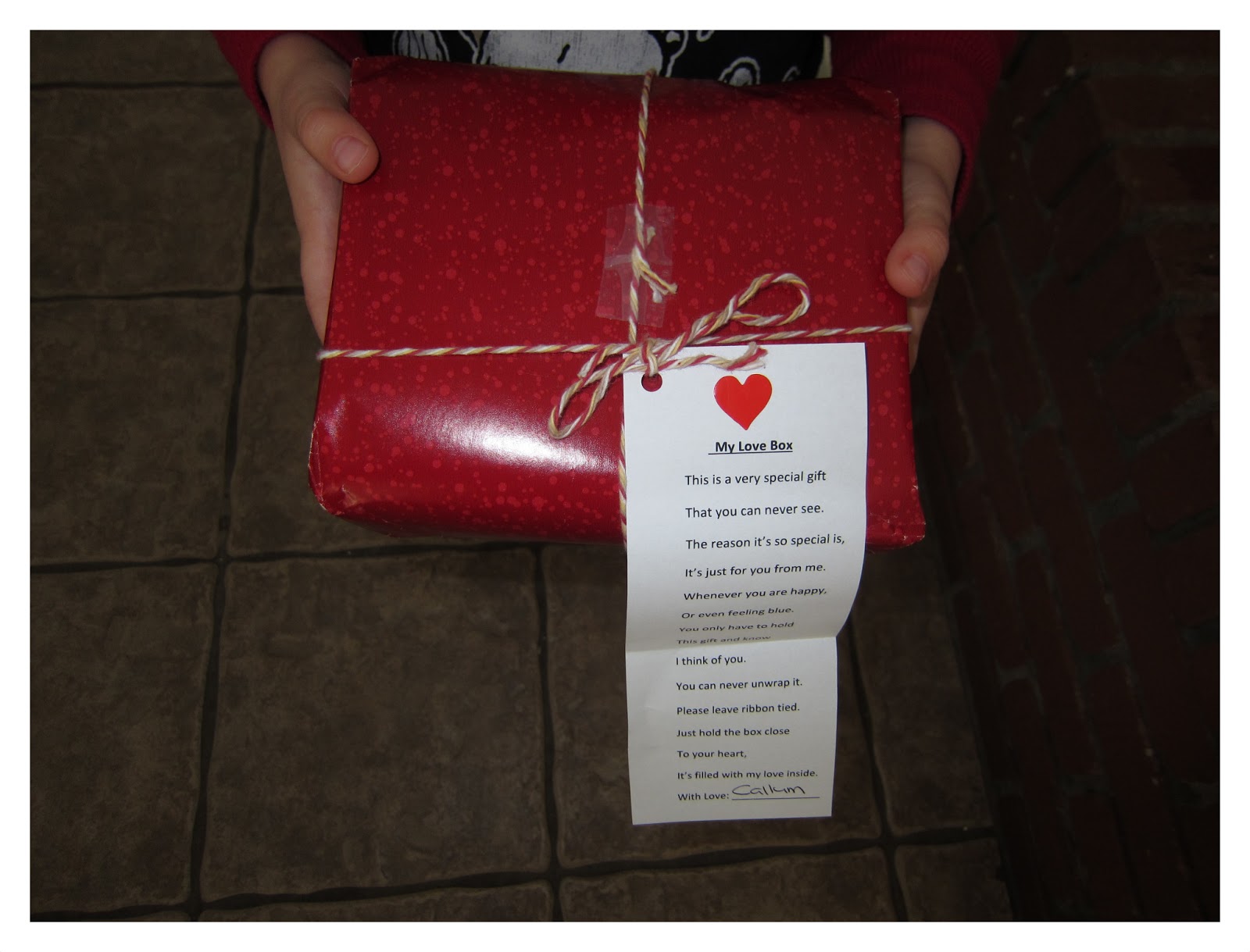 So Callum gave me a special Valentine's Day box today at school. His teacher told me I cannot open it and to read the note attached. The note said it was a special present and couldn't be opened, not even on Valentine's Day. The box is filled with his love and I am to hold onto it whenever I'm feeling happy or sad and to know he is always thinking of me. I thought it was very sweet, but Callum didn't seem to be digging this whole not opening the box thing. He wanted me to open it so bad and I told him I wasn't supposed to because it was filled with his love and it would escape if we opened the box. He wasn't buying it for a minute and just responded with, "Mommy, it doesn't have legs and it can't fly away", (duh). Okay, so I don't blame him for not buying it, but I still refused to open the box anyway. I can't put anything past this little smartie pants, lol.