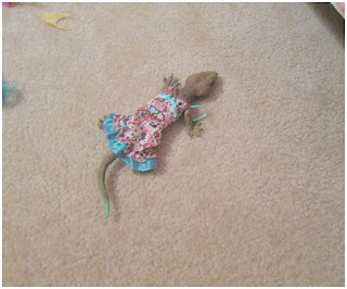 So I walked into Avery's room earlier this evening and this is what I saw laying in the corner of her floor. Callum's toy Lizard is now a Mrs. toy Lizard and a very fashionable one too. Seems she decided to dress him up in one of Barbie's pretty pink dresses. I think this is the first time I've ever seen a lizard wearing a dress!