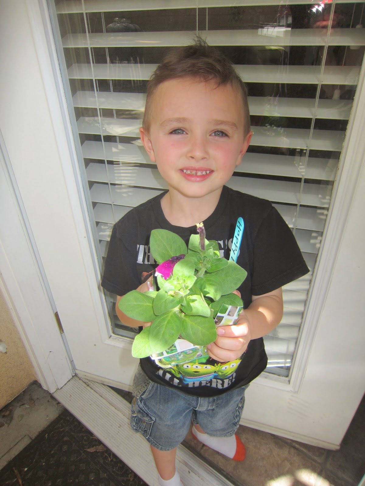 Today was gardening day at preschool and Callum got to choose a purple pansy to take home. Ms. Felisa told me how her students helped her plant flowers in her yard today. She said that Callum was a big help and wasn't afraid to get his hands in there. He really enjoyed the gardening and can't wait to plant it in the yard when it's ready. He will find a very special spot for it!