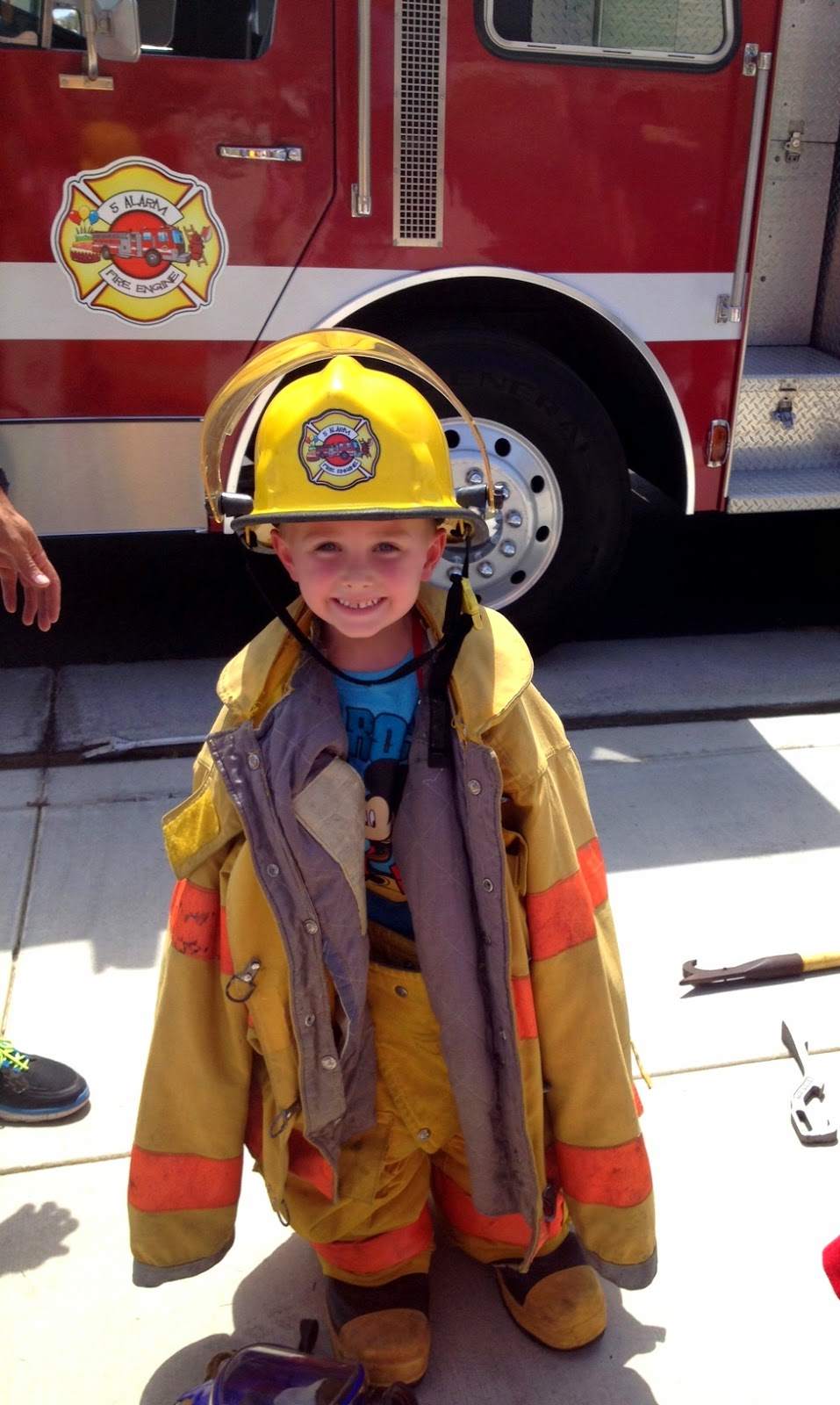 Callum recently got to play fireman at his friend Ryan's party. The firemen came and gave them a lesson on how to be a firefighter and let them play tug a war with the fire hose and the kids rode up and down the neighborhood on the firetruck. Here's my cool little fireman ready for action!!