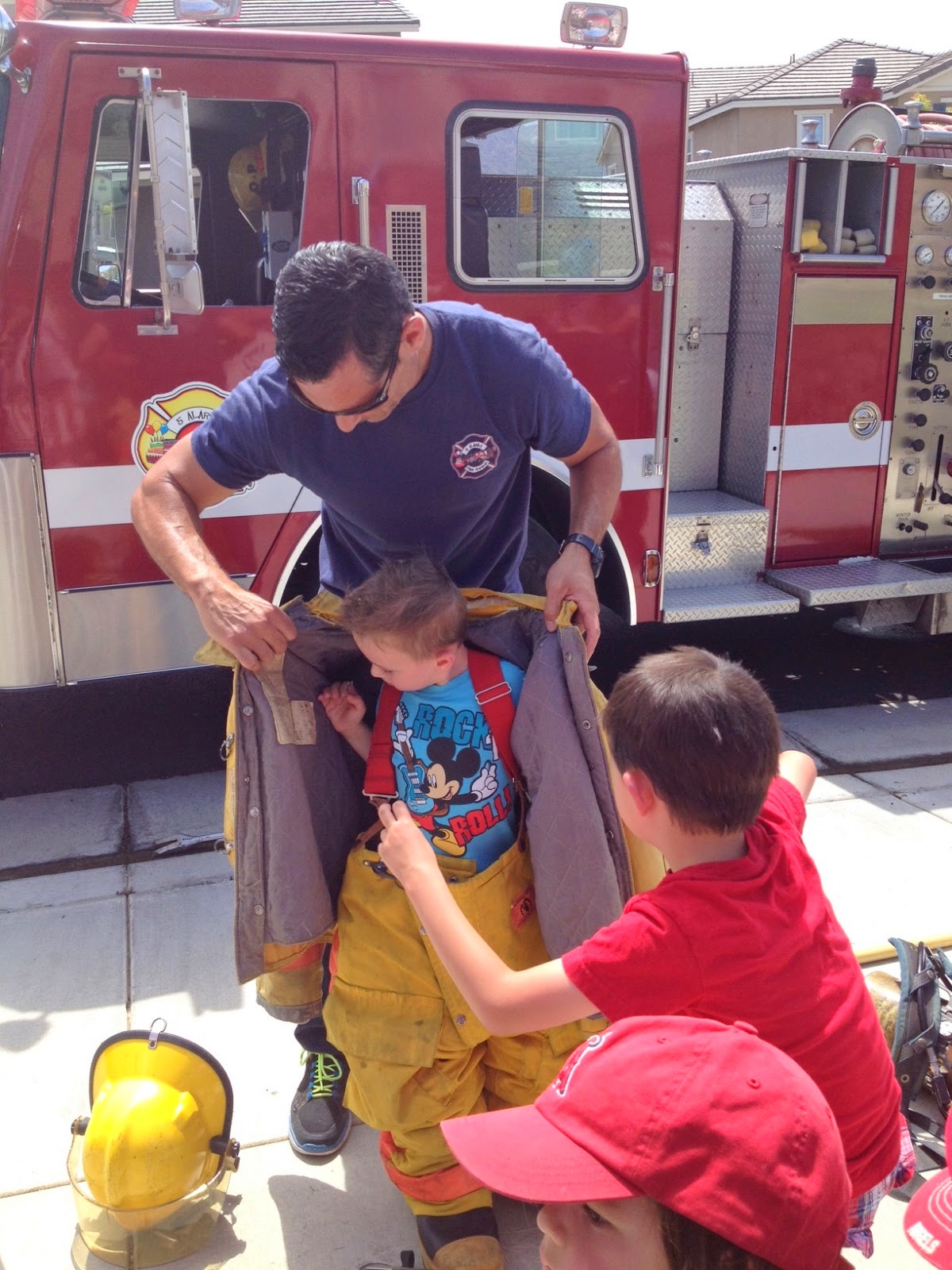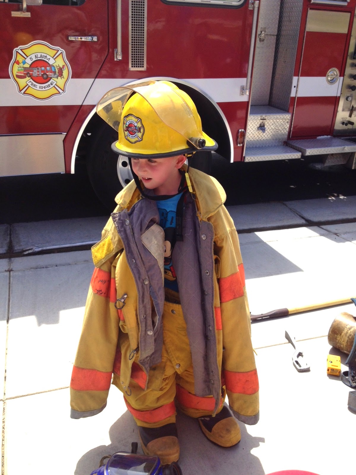 Callum recently got to play fireman at his friend Ryan's party. The firemen came and gave them a lesson on how to be a firefighter and let them play tug a war with the fire hose and the kids rode up and down the neighborhood on the firetruck. Here's my cool little fireman ready for action!!