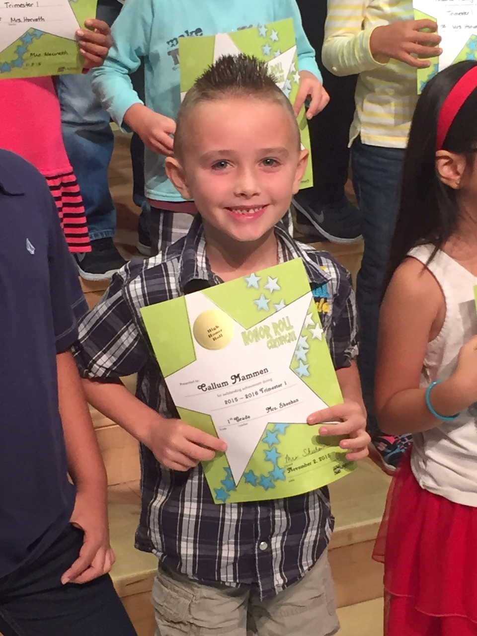 Today was an exciting day at school. We attended the students Award Assembly at Temescal Valley and Callum was awarded a certificate for making first honors this trimester. We are so proud of our little guy and how he has been working so hard. He has come a long way since the beginning of the school year. We had a little difficulty getting him through the gate in the morning and walking to his class was quite a challenge for him. The transition from kindergarten into first grade was very different and scary. He was so used to the smaller environment with the kindergarteners and now he is in there with the older kids. It was quite an adjustment for him but he got through it and now he is doing GREAT! His big sister has helped him tremendously as well and has been so helpful with getting him get to class each morning. Avery would put her arm around him and pep talk him all the way to class. It was very sweet. We see that he has definately becoming more confident on a continual basis and we are very proud of him.