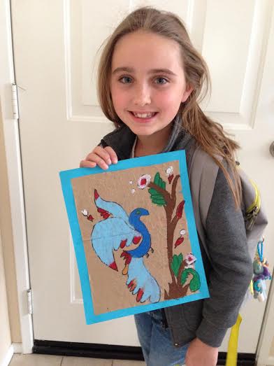 Here is Avery's latest Art Smarts project. Today she created a colorful bird on a lunch sack that was crinkled to give the appearance of Amate paper. This is my favorite one of her art pieces!