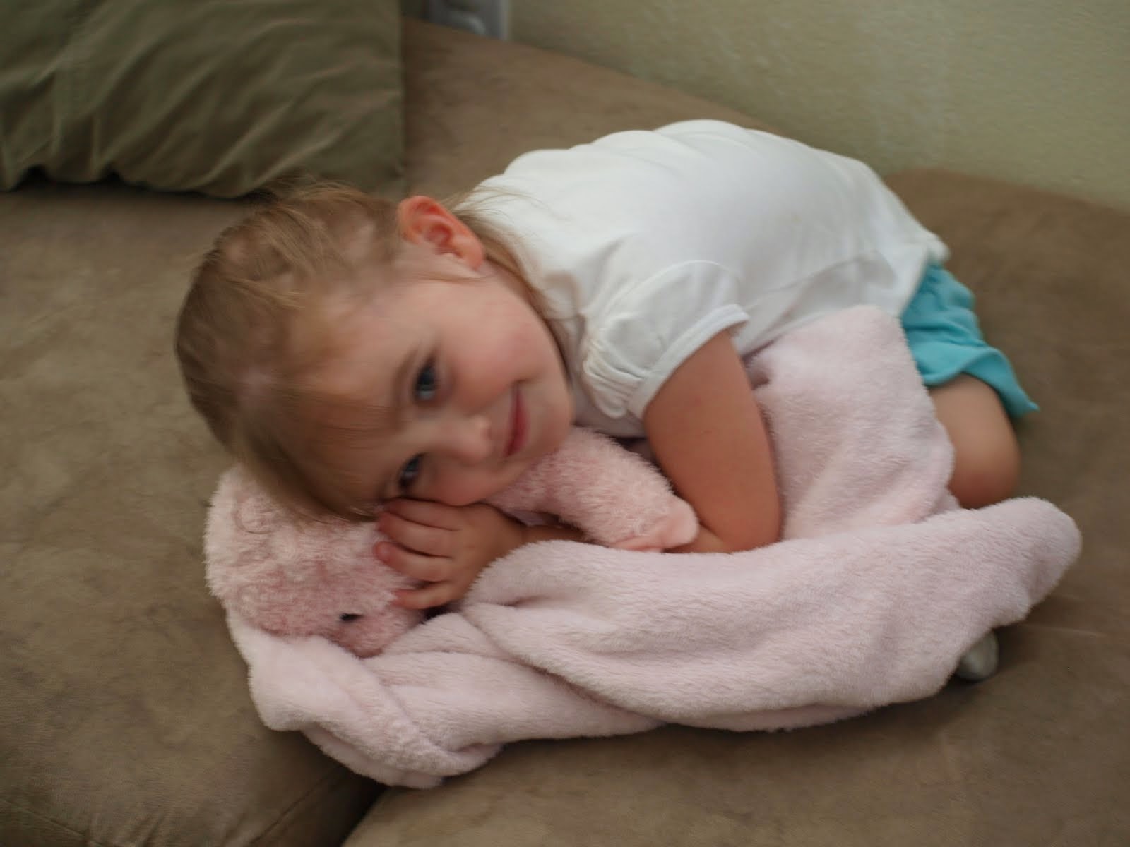 She couldn't have been happier to cuddle with her piggie and blankie when she got home