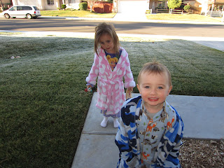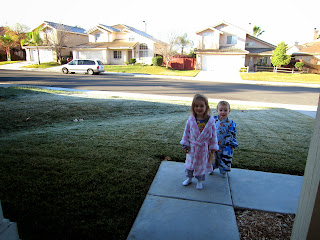 I think this morning has to be one of the coldest mornings we've had so far this winter. It is 26 degrees outside with ice all over our lawn. Avery and Callum took a second to step outside the front and this is what they discovered. Brrrr!!!!