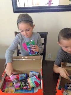 So every year we've made it a point to donate to an organization called "Operation Christmas Child." What we do is find our old shoe boxes and fill them with lots of goodies for other kids in need. Avery and Callum each pick out their own personal items that they would like to put inside the box, include a special letter, and then we deliver it to one of the nearby donation centers. It's a great program and we all have so much fun doing it.